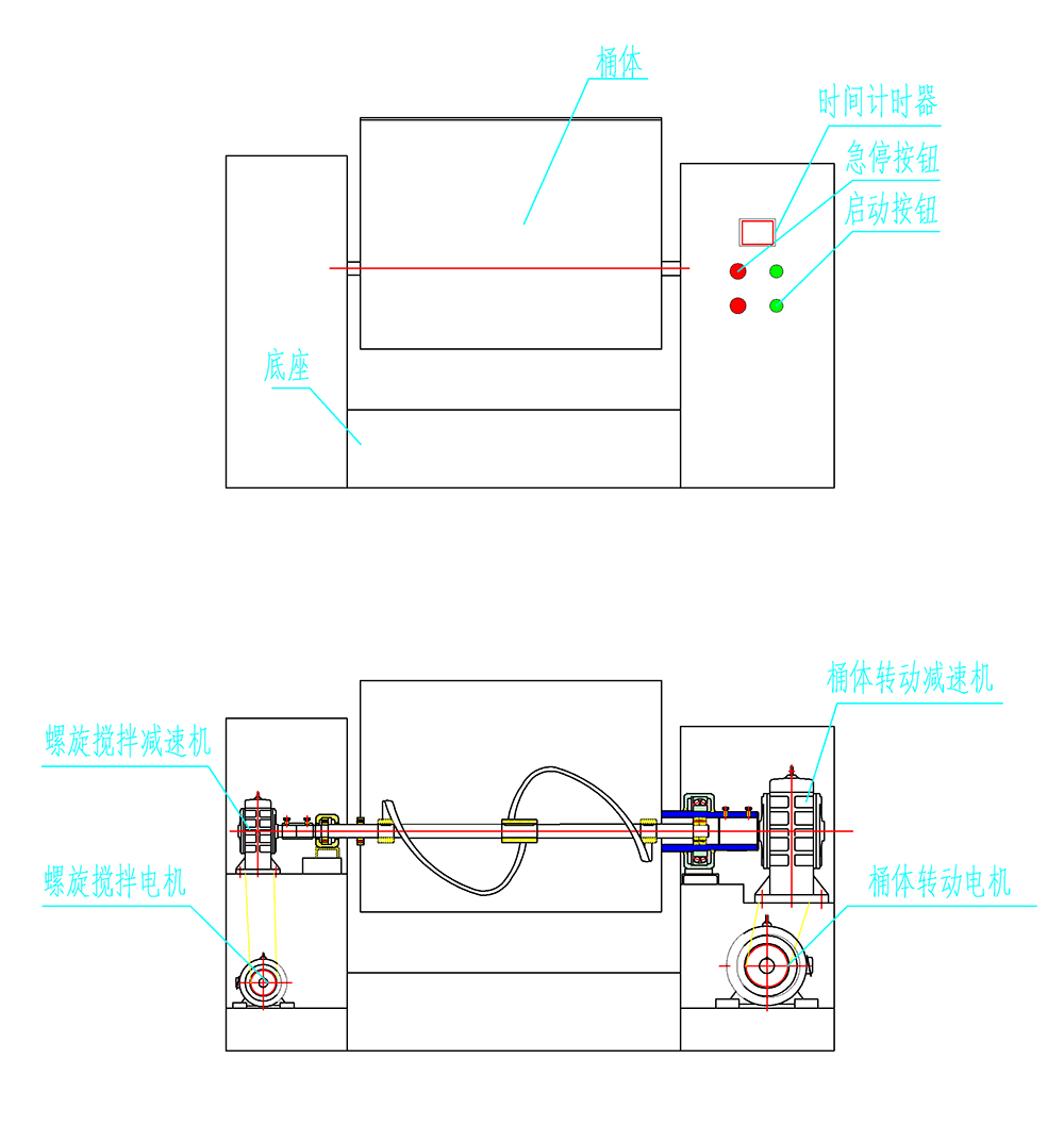 本机与物料接触部分均采用不锈钢材料制成,搅拌轴两端设有密封装置,能防止物料外泄,搅拌轴在减速机的带动下,24r/min将物料均匀搅拌,出料时可点动操作按钮,使槽体倾斜105度即可。